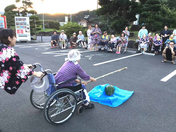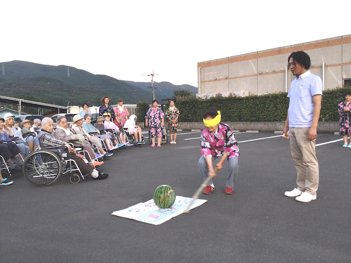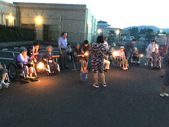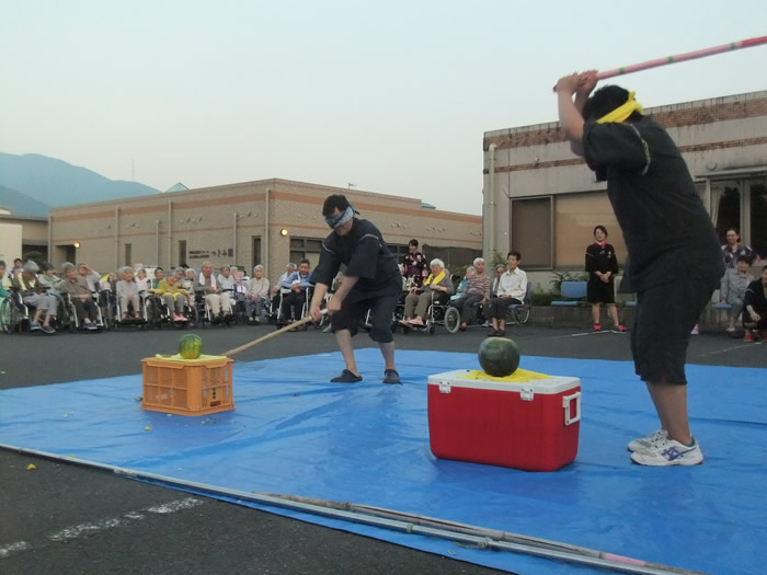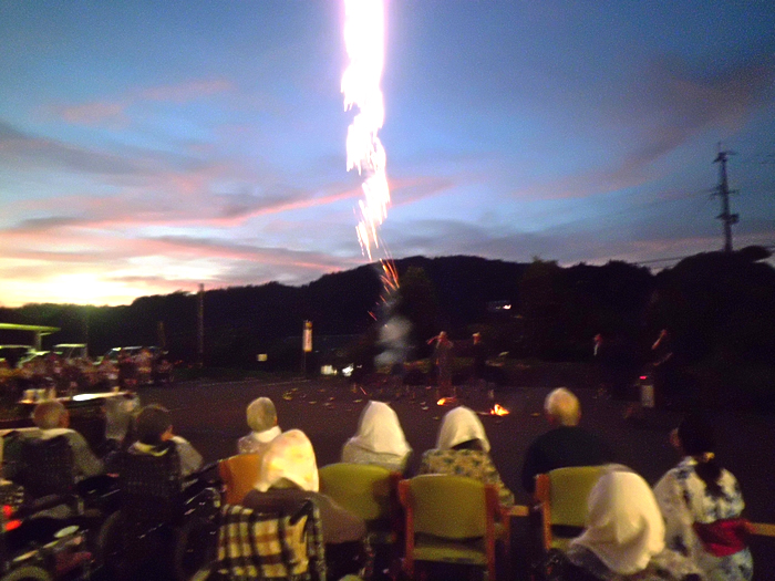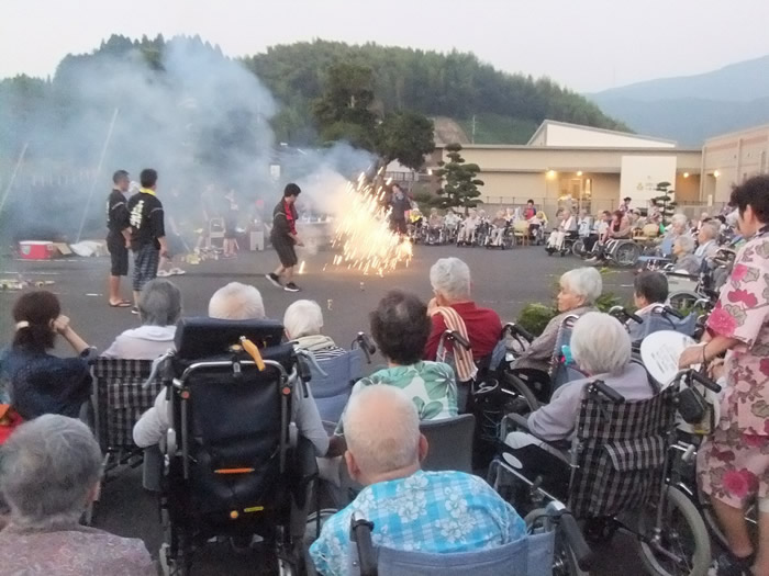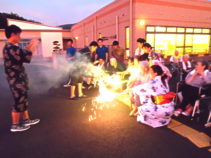 毎年恒例となっております納涼花火大会を今年も開催しました。スイカ割り、盆踊りの後、手持ち花火や打ち上げ花火を行い、最後は恒例のナイアガラの花火で締めました。なかなか外出できない利用者様にも季節を感じていただけたのではないでしょうか。