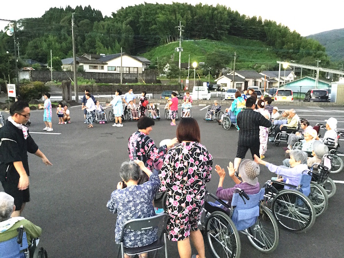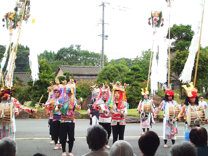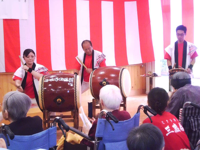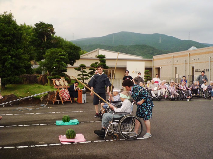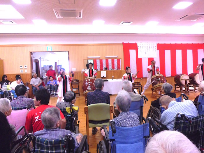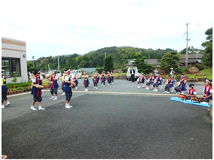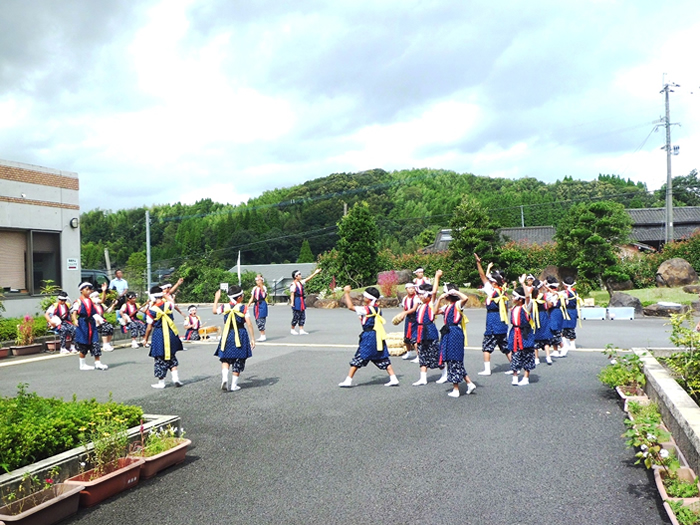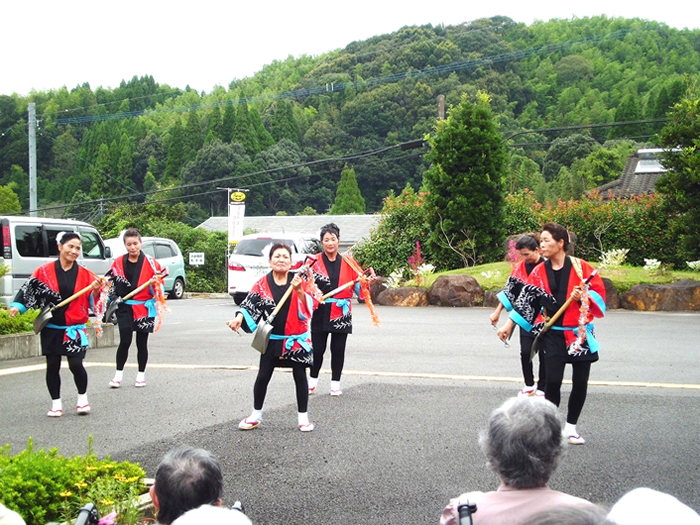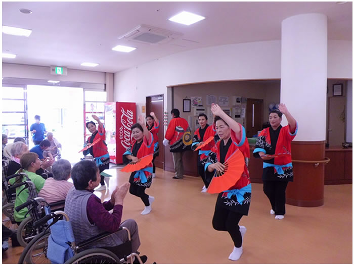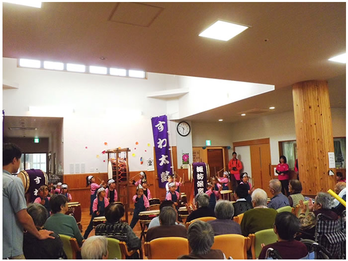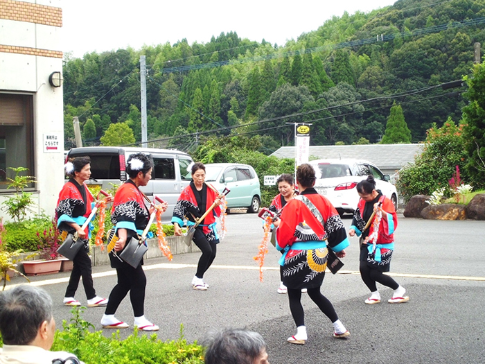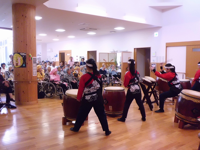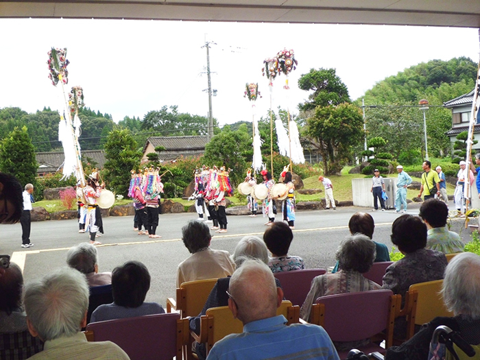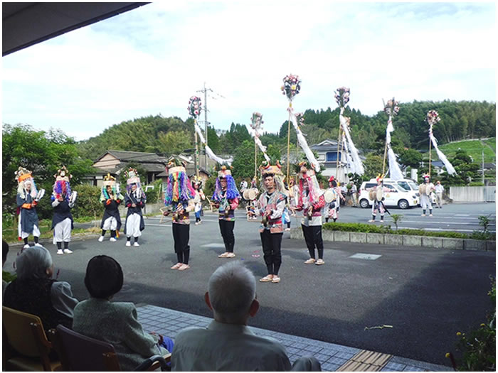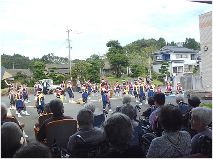 今年も豊日霎神社の秋の大祭が執り行われました。太鼓踊りと地元女性会の踊りも園に来られ、利用者様の前で披露していただきました。毎年恒例となっている地元の大祭なので、地元に住まれていた利用者様方は目を見開いて喜ばれているようでした。