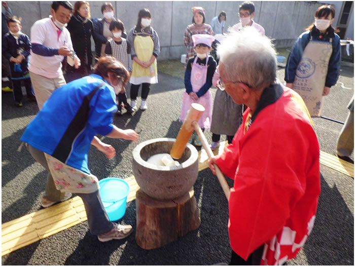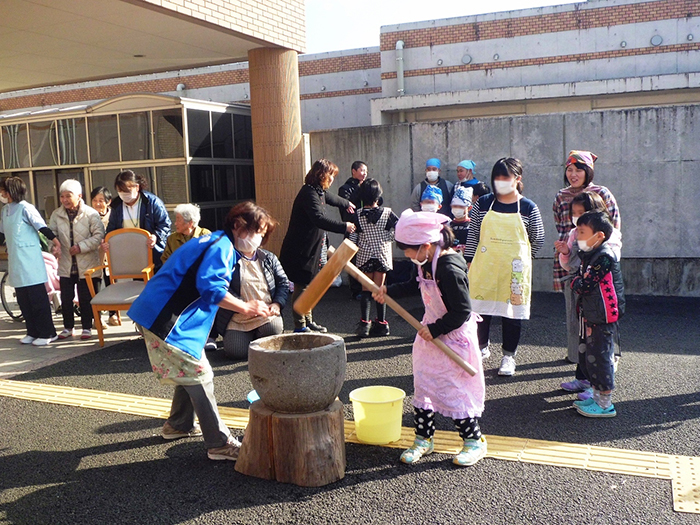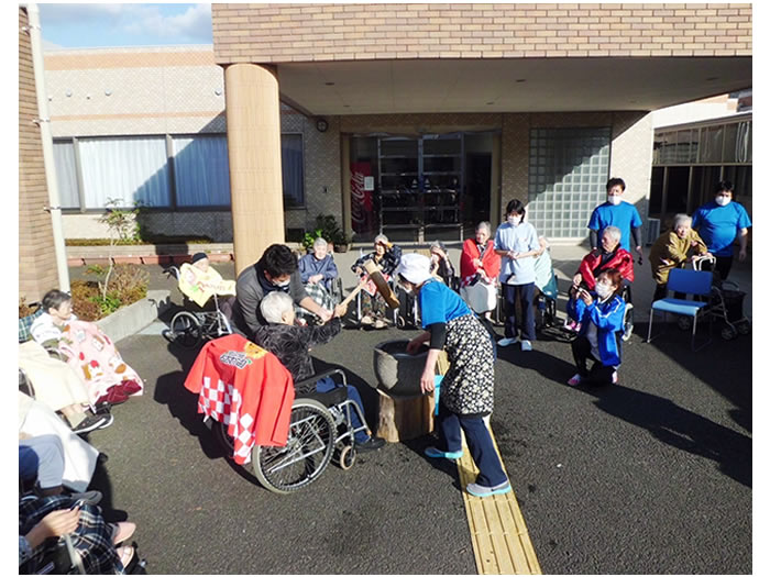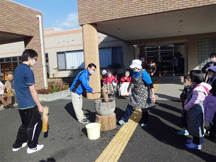 年末恒例となりました、餅つきを今年も行いました。今年は天候にも恵まれ、地域の子供たちにも参加いただき昔懐かしい杵と臼で餅をついていただきました。また、ついた餅は各施設にて利用者様に丸めていただき、楽しまれていました。