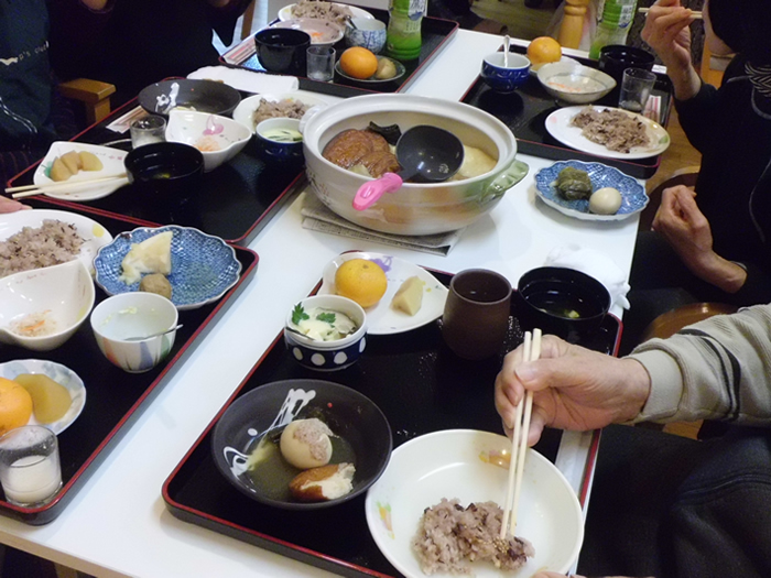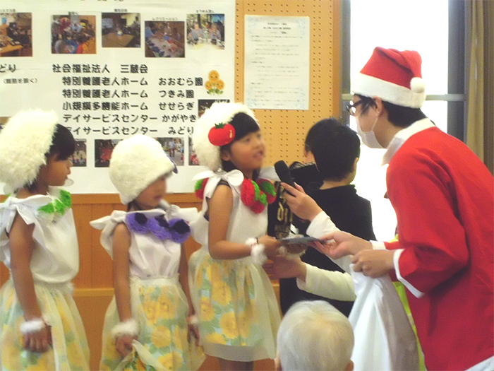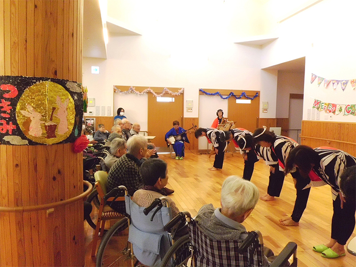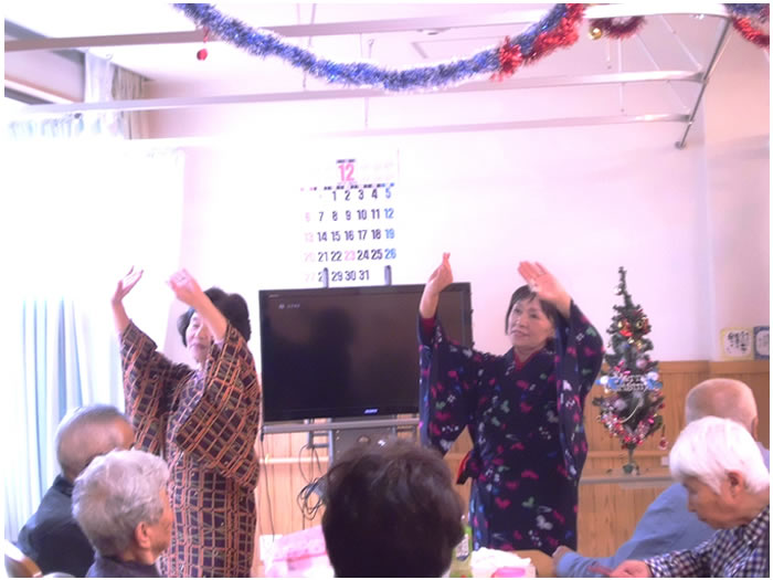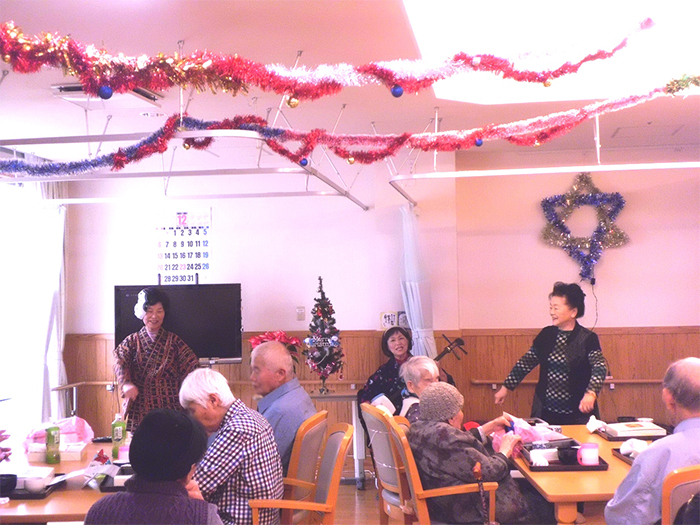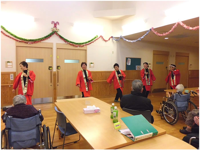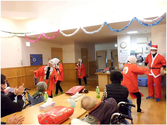 今年も、多数のご家族に来園いただき、クリスマス・忘年会を開催しました。ご家族のグループにより踊りや太鼓など、皆様楽しまれていました。また、小規模多機能ホームせせらぎでは、職員でおでんや赤飯などを調理し、提供いたしました。利用者様、ご家族よりおいしいとのお言葉をいただきました。