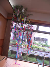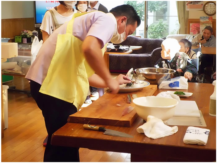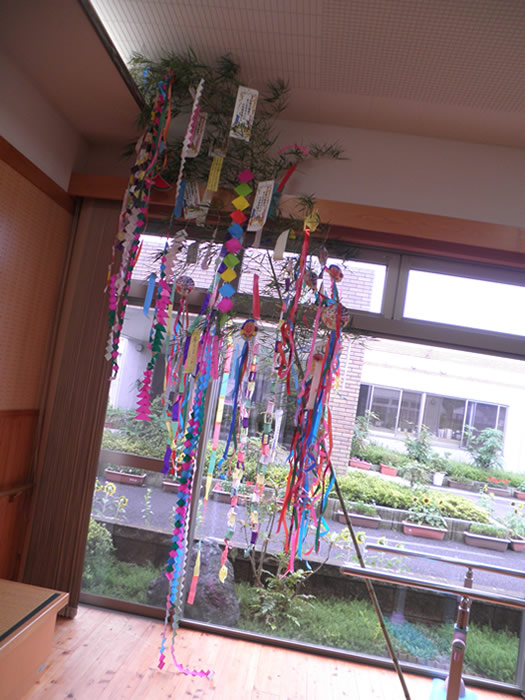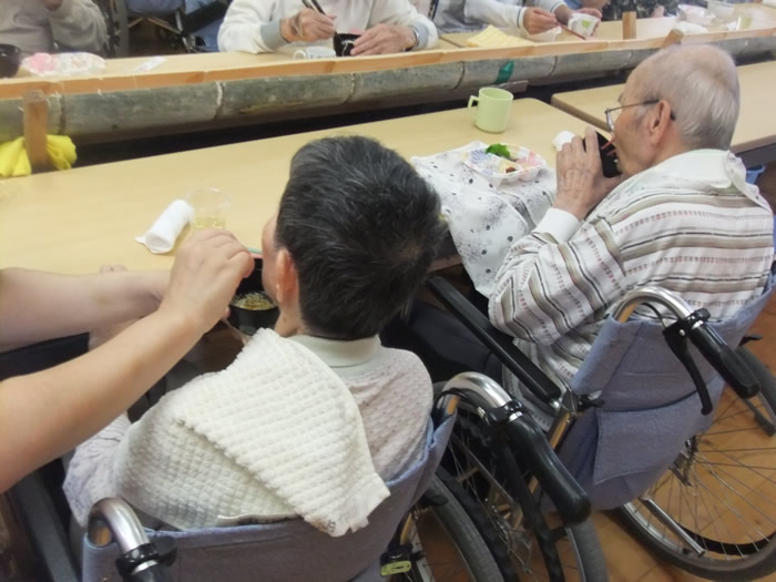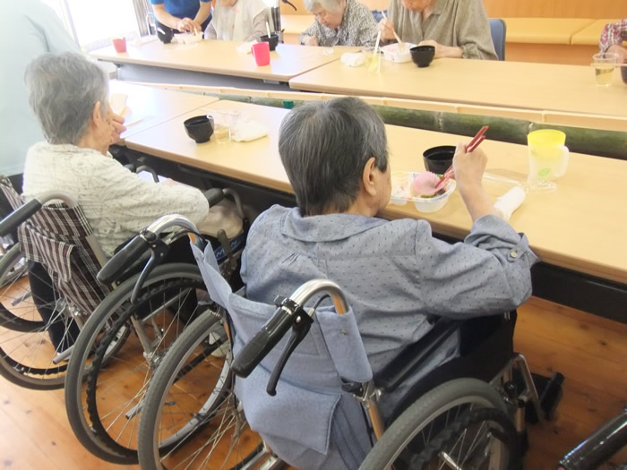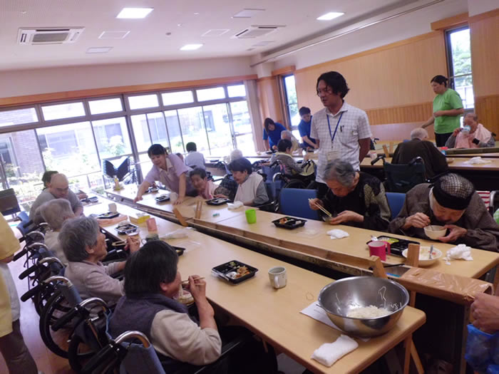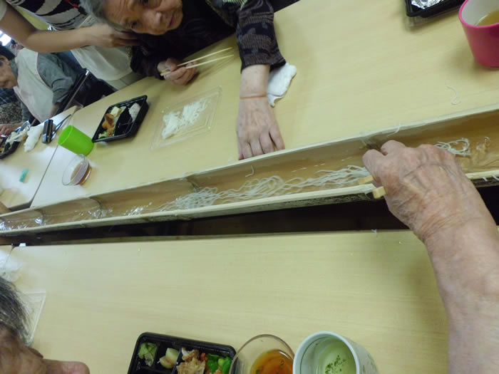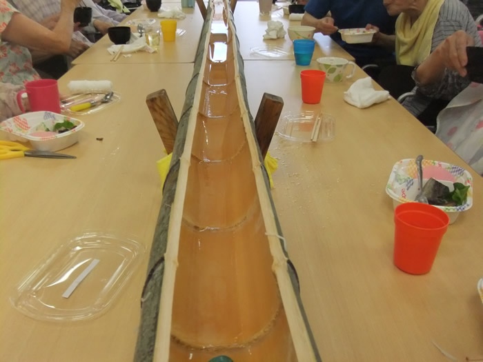 毎年7月頃に園内でそうめん流しをしています。本物の竹を二つに割り、その中に水とそうめんを実際に流して利用者様に食べていただいています。本物の竹を使用することで風流で季節を感じていただいています。