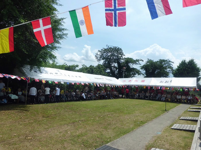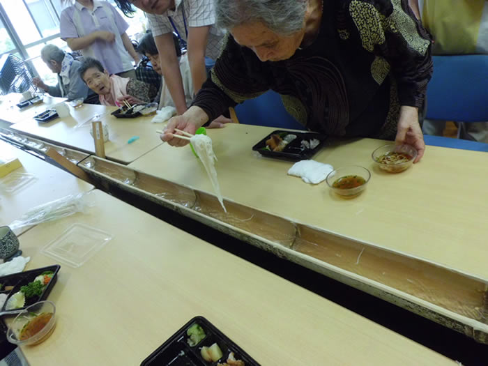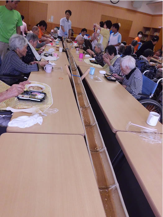 特別養護老人ホームおおむら園、つきみ園では、毎年、竹を利用し園内にてそうめん流しを行っております。また、デイサービスセンターかがやき、みどり、小機の多機能ホームせせらぎは、外部のそうめん流しに外食に行っております。皆様美味しいと召し上がっていらっしゃりました。