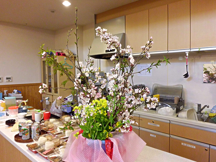 特別養護老人ホーム おおむら園では毎年中庭でお花見を催しています。今年はあいにくの天気で外に出ることができず、さくらユニット内で皆様お弁当を召し上がられました。いつもと違う雰囲気で楽しまれていました。