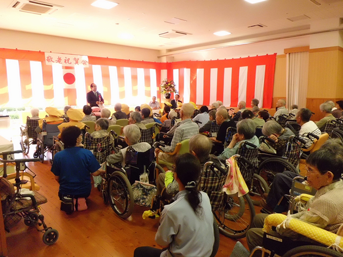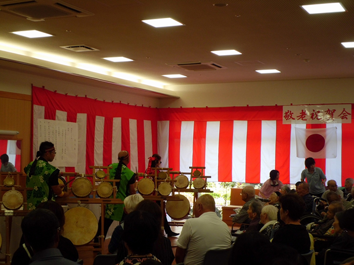今年より特別養護老人ホームつきみ園の増床に伴い、特別養護老人ホームおおむら園、小規模多機能ホームせせらぎを午前中、特別養護老人ホームつきみ園を午後から開催しました。今年は百寿、白寿を始め、皆様の長寿をお祝いさせていただきました。三蔵会、家族会からの記念品贈呈やボランティアによる太鼓、職員の花笠音頭など楽しまれていました。