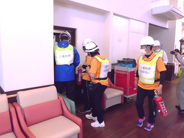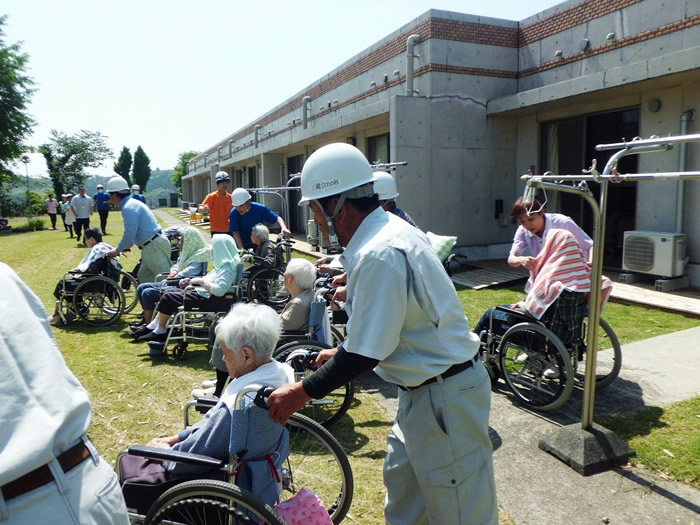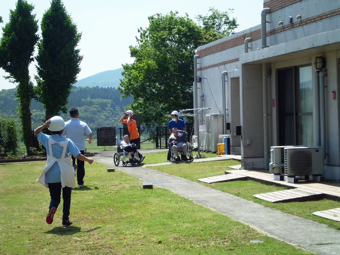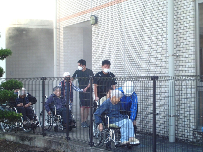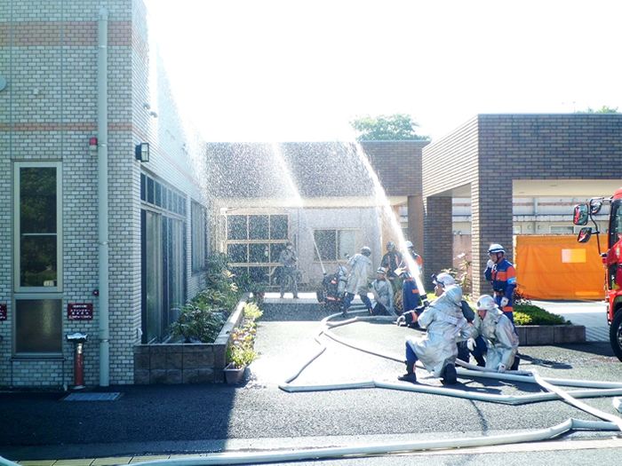 年に2回、消防訓練を実施しています。消防署職員と地域住民の皆様にご協力いただき、最後には水消火器で実際の消火器の使用方法を実践するなど利用者様の安全のため、全力で訓練を実施しています。