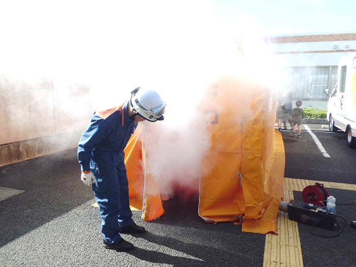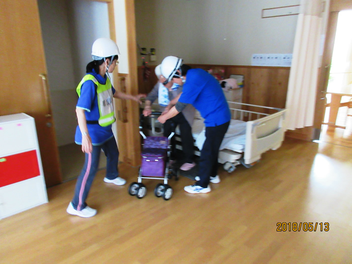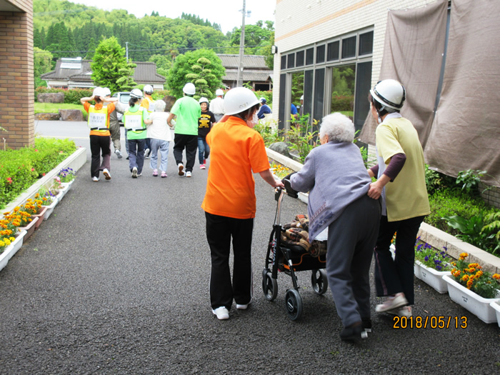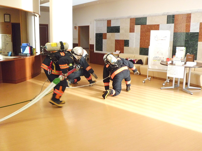 11月12日に本年2回目の消防訓練を実施しました。今回は、薩摩川内市消防局の東部消防署祁答院分署と合わせて、東部消防署本署、薩摩川内消防団上手分団、黒木分団、薩摩川内警察署東交番が協同しての総合消防演習を、当法人にて開催しました。通常の消防訓練に加え、避難困難者の救出訓練、放水訓練を行ない、煙体験ハウスでは職員や地域住民の皆様が体験され、非常に有意義な訓練となりました。