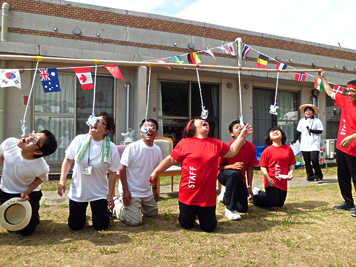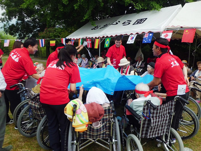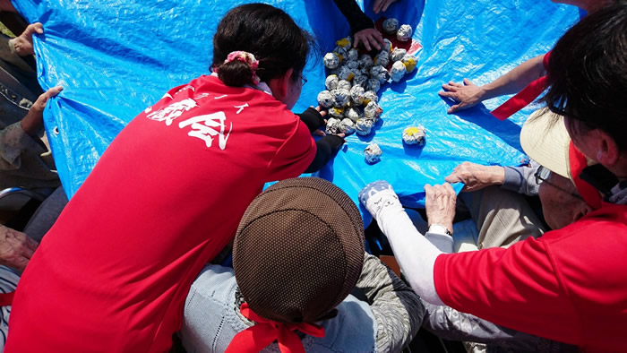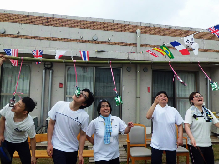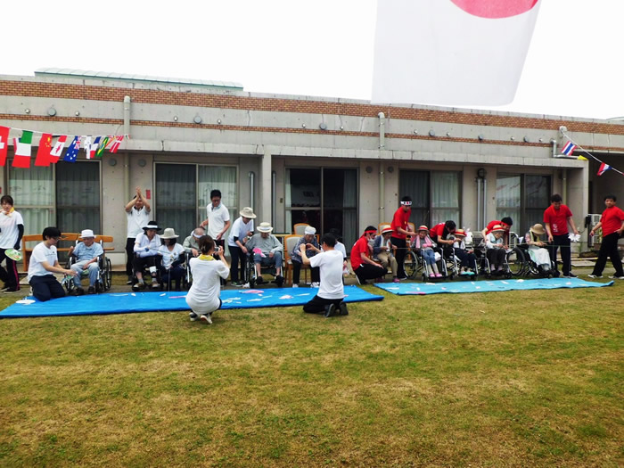 天候にも恵まれた5月31日、中庭にて法人内運動会を開催しました。つきみ園が赤組、おおむら園・小規模せせらぎ・デイかがやき・デイみどりの合同チームが白組で宝釣りや玉落とし、パン食い競争などで行いました。今年は白組(合同チーム)が僅差にて優勝となりましたが、皆様真剣に取り組まれており、楽しんでいただけたのではないかと思います。