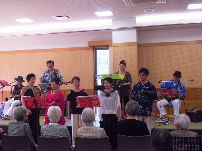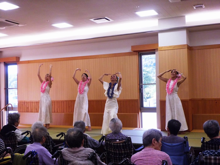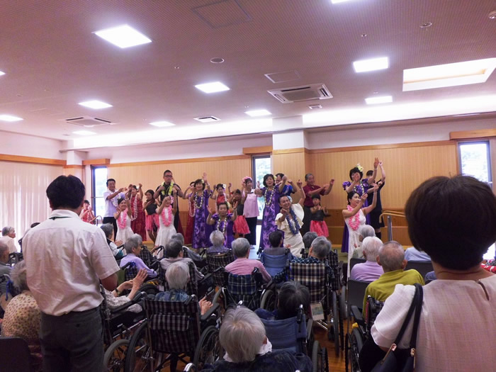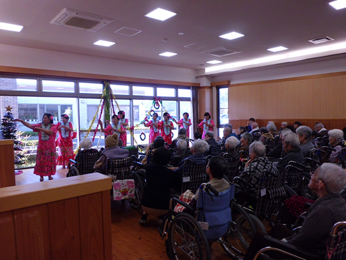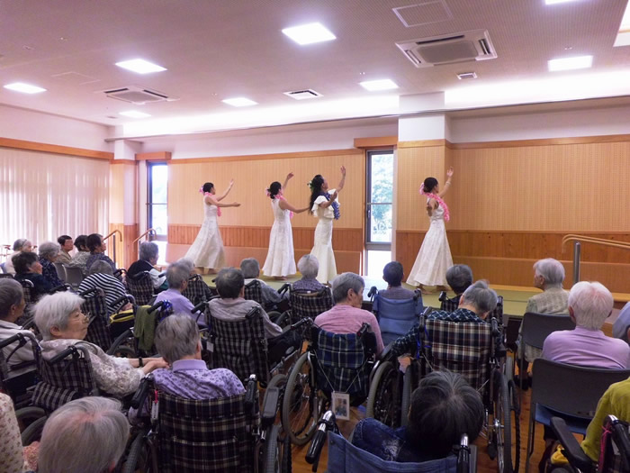 楽器演奏、フラダンスの方々に来園いただきました。皆様喜ばれ、楽しまれていらっしゃりました。 なお、三蔵会では歌や踊りなどだけでなく、高齢者とのふれあいボランティアを随時受け付けております。ご希望の方は事務局(TEL:0996-55-1313)へお気軽にお問い合わせください。