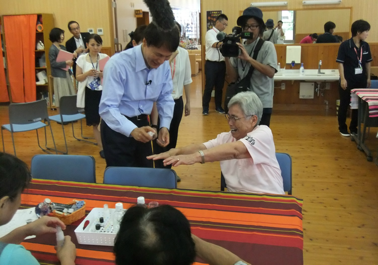 8月9日に鹿児島県知事がちいきのカフェひまりに視察に来園され、イベントの笑いヨガに皆様と一緒に体験いただきました。その後、アロマで虫よけスプレー作りを行い、皆様と交流を行われました。皆様大変喜ばれ、笑顔で参加されていました。